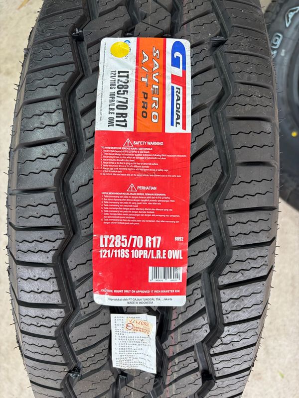 GTRadial 的 SAVERO A/T PRO 是 285/70/17 規格的知名全地形輪胎,具備 Z 型中心肋塊與 3D 切角設計,強化劣路抓地與碎石排出。該胎款提供優異的煞車穩定性、低噪音以及加強的胎壁保護,適合重視越野性能與舒適度的輕卡及 SUV。